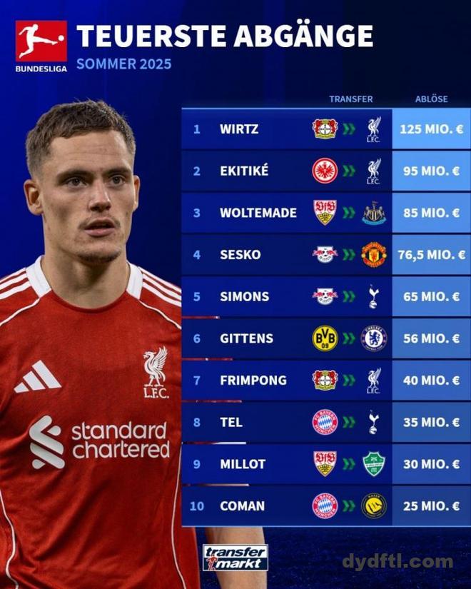 直播吧9月4日讯 德甲夏窗已经截止,《转会市场》也统计了德甲今夏的最贵卖人榜,维尔茨断崖领跑。 德转列德甲今夏 […]