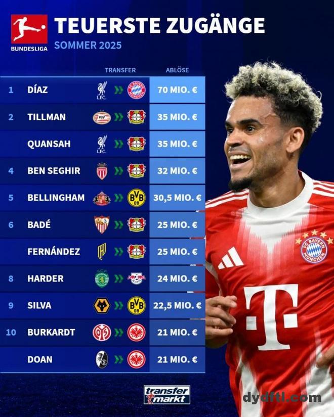 直播吧9月4日讯 德甲夏窗已经截止,《转会市场》也统计了德甲今夏的最贵引援榜,路易斯-迪亚斯断崖领跑。 德转列 […]