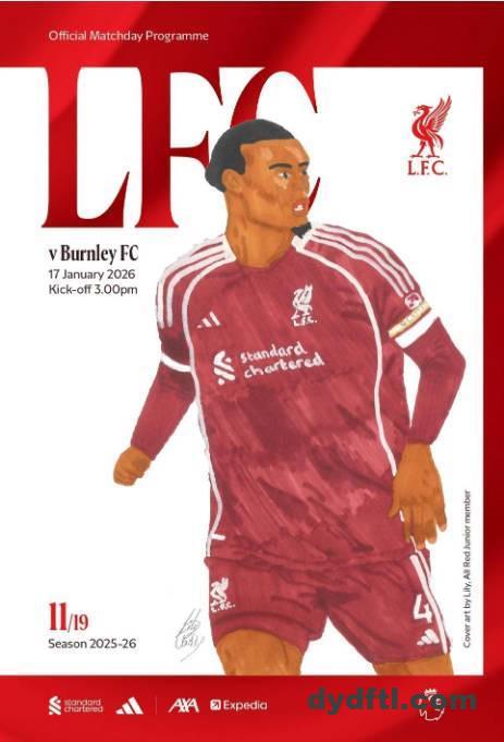 北京时间本周六晚23点,利物浦将迎来英超第22轮主场对阵伯恩利的比赛,赛前,利物浦官方发布了本场比赛的官方比赛日手册封面,并且透露,这是由一位叫做莉莉的13岁球迷完成。
