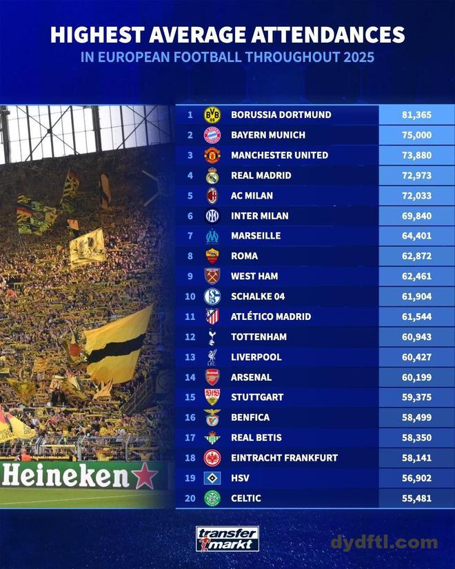 12月29日,德转发布了2025年欧洲俱乐部场均上座榜,多特以场均近8.1万人的上座人数稳居榜首,拜仁与曼联则紧随其后。