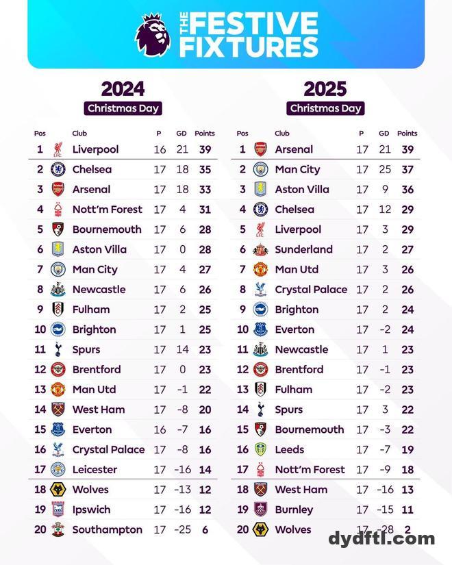 北京时间12月25日,德转列出了2024年和2025年圣诞节当天的英超积分榜,巧合的是,利物浦和阿森纳以相同的积分以及净胜球分别排名第一。与上赛季同期相比,阿森纳(+6分)、曼城(+10分)、阿斯顿维拉(+8分)以及曼联(+4分)成绩均有提升。