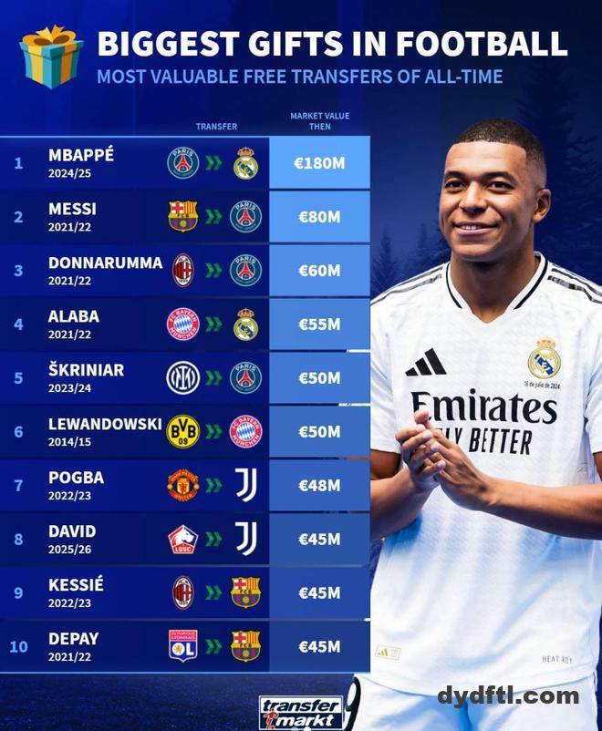 北京时间12月26日,德转列出了历史免签球员身价榜,去年夏天从巴黎圣日耳曼自由转会皇家马德里的姆巴佩以1.8亿欧元高居第一,2021年从巴塞罗那转投巴黎圣日耳曼的梅西8000万欧元位列第二。