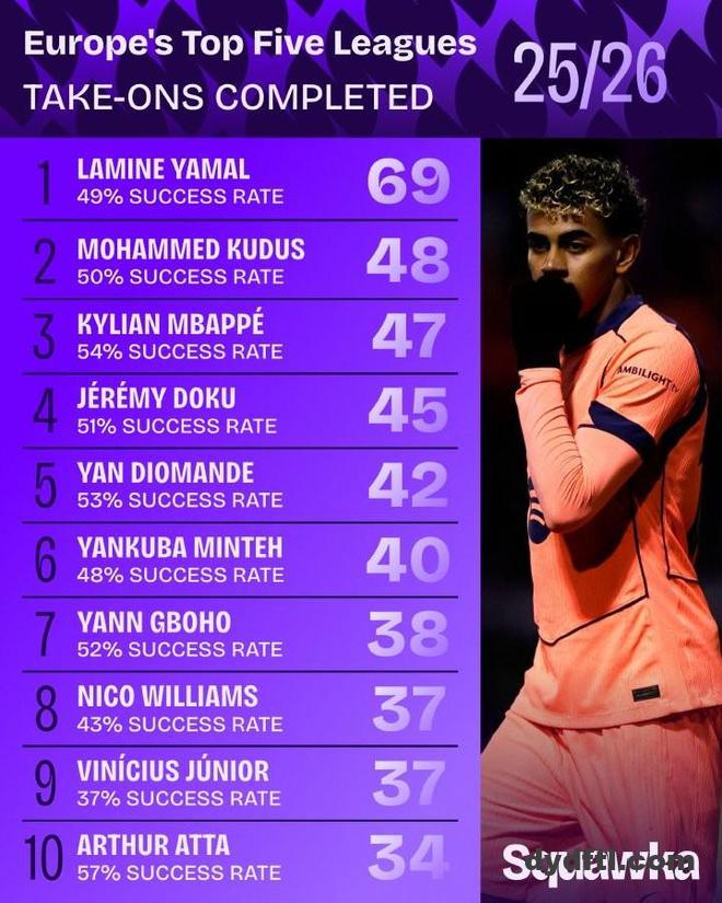 根据统计,本赛季到目前为止,亚马尔是欧洲五大联赛当中成功过人次数最多的球员,库杜斯位居第二,姆巴佩位居第三。