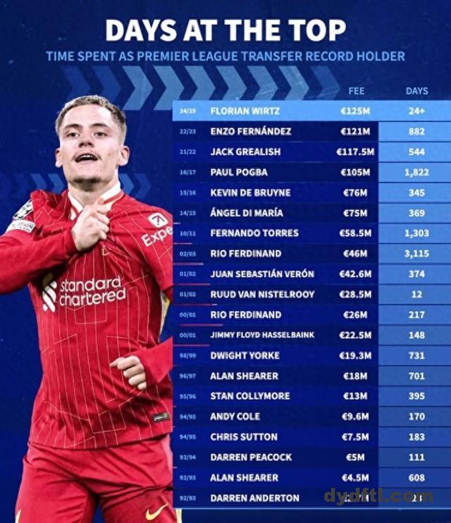 直播吧7月26日讯 《转会市场》统计了英超历任标王占据榜首的天数,新标王维尔茨刚24天。 德转列英超历史标王“ […]