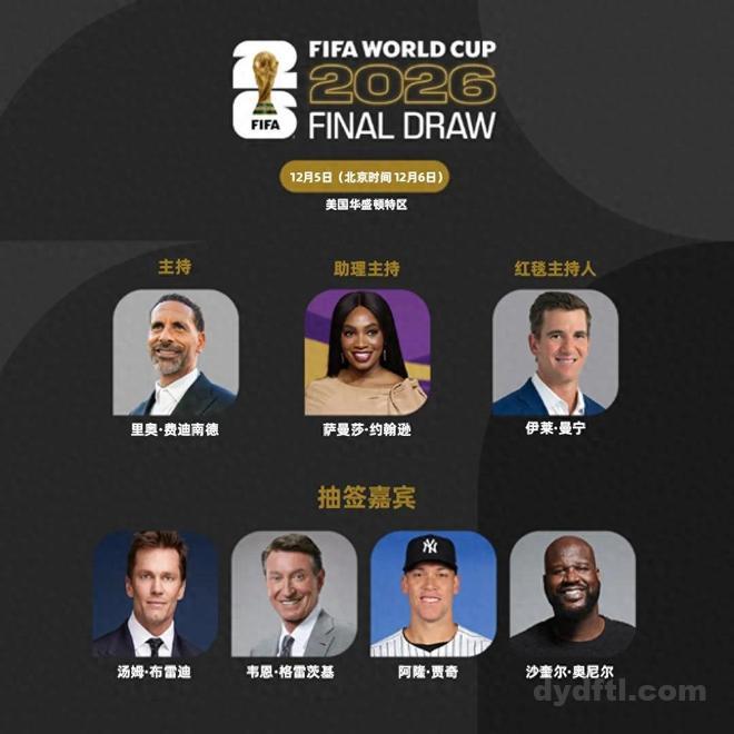 北京时间十二月六日万众瞩目的世界杯抽签仪式在美国华盛顿肯尼迪艺术中心举办,这也是世界杯改制以来的第一次抽签。本次抽签仪式由著名球星费迪南德主持。抽签嘉宾包括NBA球星奥尼尔、布雷迪、贾奇等著名的美国体育界的明星。