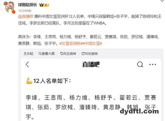 北京时间7月12日,根据媒体直播吧的报道,中国女篮亚洲杯的12人名单已经确定,最终裁掉了陈明伶、王佳琦,中锋位置上只留下了韩旭、张子宇。