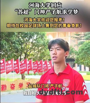 在苏超赛场,盐城队25号门将严子航表现出色。这位仅17岁的年轻人在采访中表示目标是河海大学。这座江苏省内的211高校也对严子航表达了欢迎。