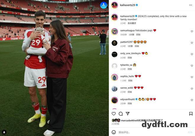 随着英超联赛最后一轮,阿森纳客场2-1绝杀南安普顿,阿森纳本赛季比赛全部结束。近期,阿森纳球员哈弗茨在个人社媒晒出自己与妻子、孩子在主场对阵纽卡比赛的赛后合照,并写道:“2024/25赛季结束,这次有一个新的家庭成员!”
