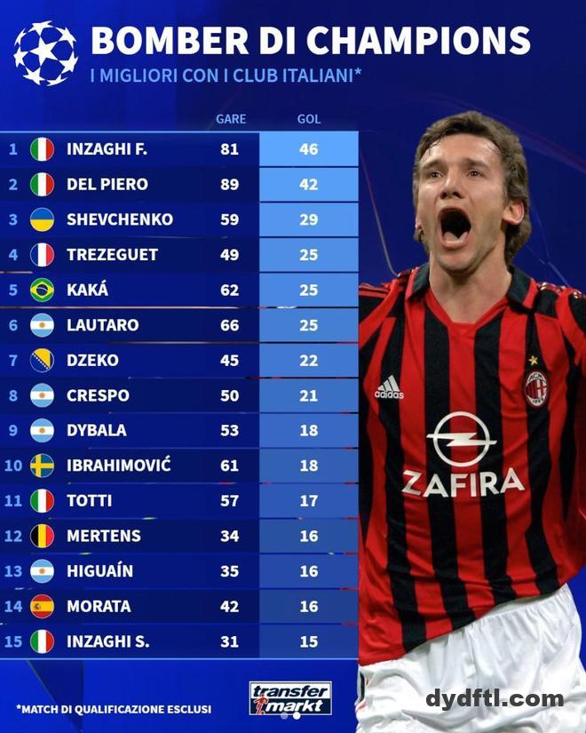 北京时间3月21日,德转统计出了意甲球员欧冠历史射手榜,菲利波-因扎吉以46球位列第一,现役球员中劳塔罗排名最高,他以25球位列第6。