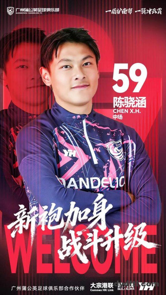 广州蒲公英官方宣布,曾在日本接受短期训练的18岁中场陈骁涵加盟俱乐部。