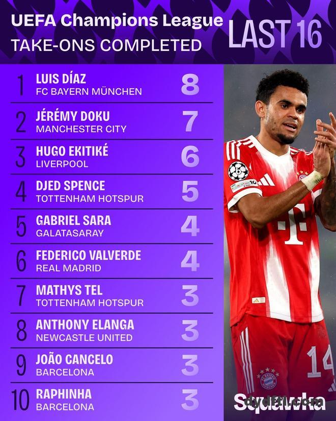 欧冠1/8决赛首回合,拜仁客场6-1大胜亚特兰大,拜仁边锋路易斯-迪亚斯发挥出色,送出一次助攻。