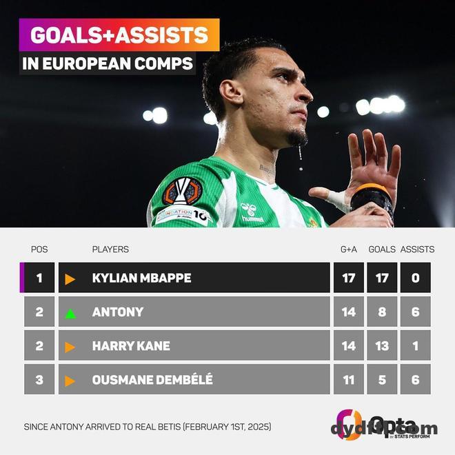 北京时间1月30日,在欧联杯联赛阶段的末轮比赛中,安东尼上半场就贡献了一射一传,帮助皇家贝蒂斯前45分钟过后主场2-0领先于费耶诺德。