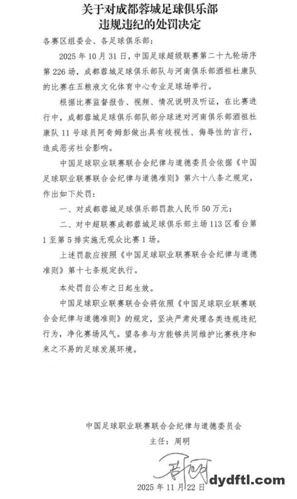 中足联官方发布公告,因成都队部分球迷对阿奇姆彭有歧视侮辱言行,对成都蓉城俱乐部罚款50万元,对其中超联赛主场113区看台前五排实施无观众比赛一场。