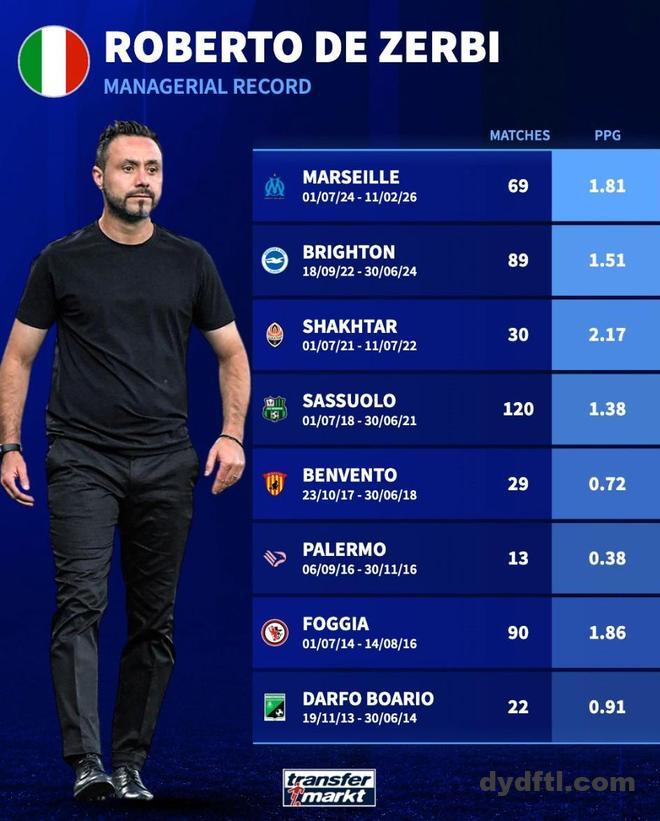 北京时间3月31日,在德泽尔比被认为接近接手托特纳姆热刺的情况下,德转统计出了这位意大利教头教练生涯至今执教各支球队的场均积分,其中最高为顿涅茨克矿工时期的2.17分,布莱顿时期则为1.51分。