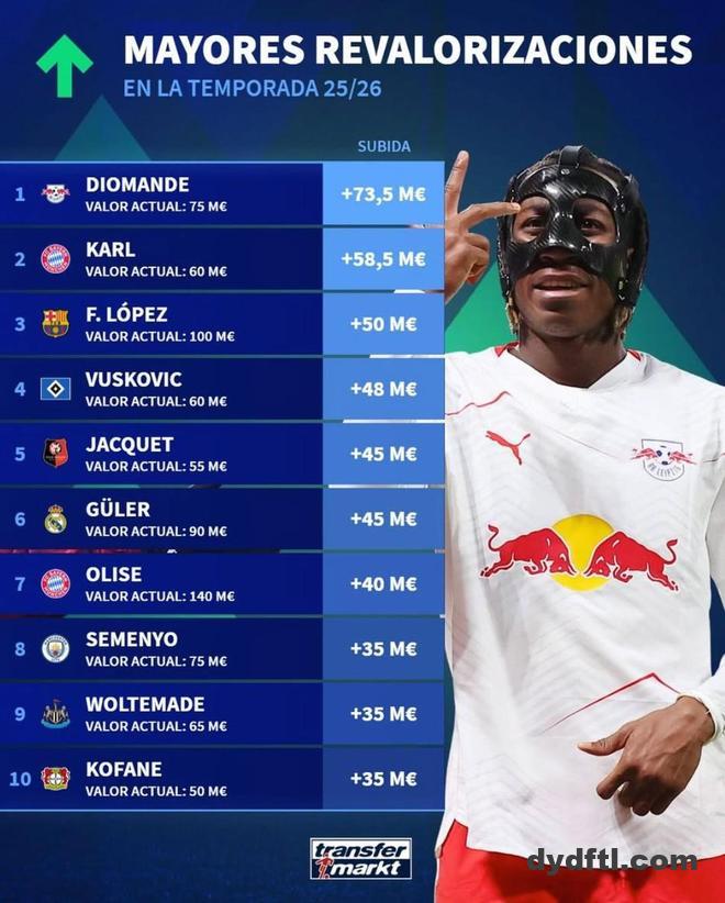 北京时间3月31日,德转列出了本赛季至今世界足坛身价涨幅最高的10名球员,RB莱比锡边锋扬-迪奥曼德暴涨7350万欧元位列第一,伦纳特-卡尔、费尔明-洛佩斯、居莱尔、奥利塞、塞门约以及沃尔特马德上榜。