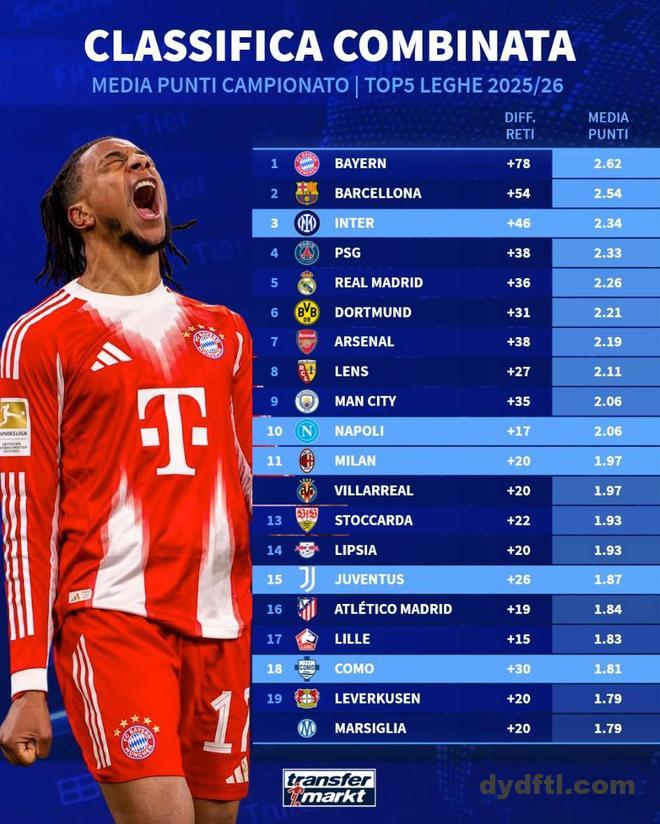 北京时间4月15日,德转统计出了本赛季至今欧洲五大联赛场均积分最高的20支球队,拜仁慕尼黑以2.62分和+78的净胜球高居所有球队的第一位,西甲领头羊巴塞罗那2.54分第二,意甲领头羊国际米兰2.34分第三,阿森纳跌至第7位。