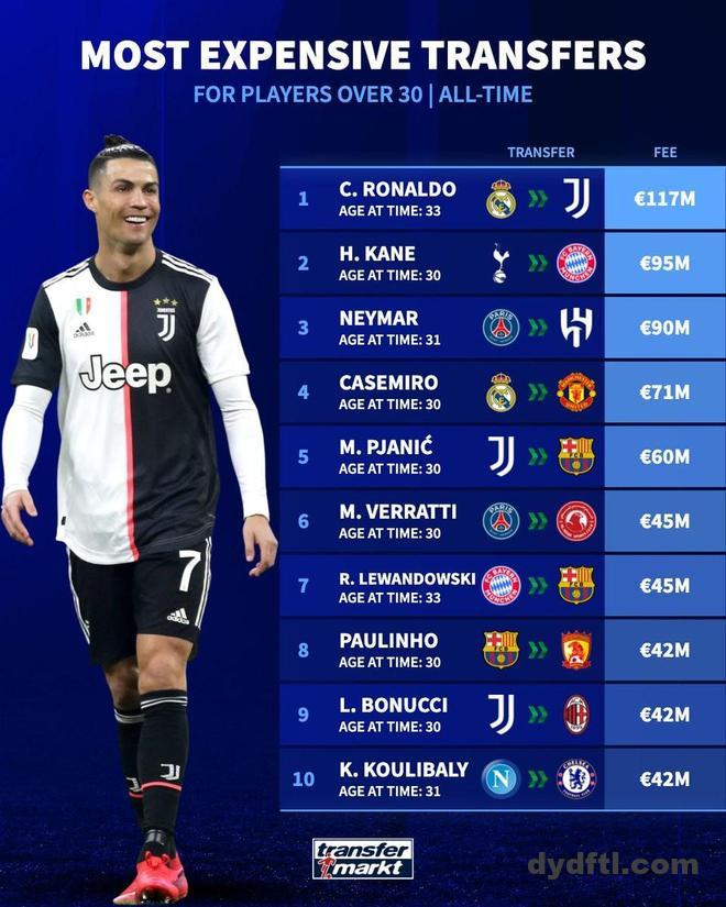 北京时间10月29日,德转统计出了30岁以上的球员转会费榜,其中C罗以1.17亿欧元居首,凯恩内马尔分列二三。