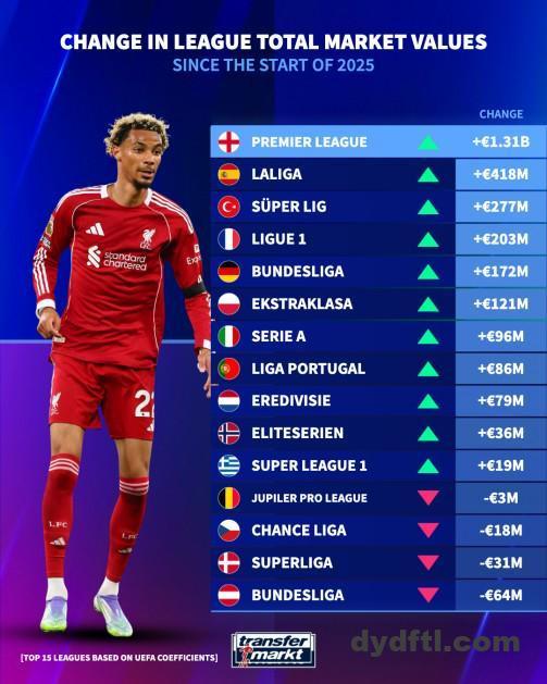北京时间10月25日,德转统计出了欧洲15大联赛2025年球员总身价的涨跌榜,英超以增加超13亿欧元高居第一,西甲增加约4.2亿欧元第二,意甲为5大联赛涨幅最少的联赛,仅增加9600万欧元。