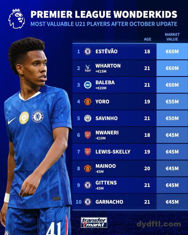 在更新了英超球员身价后,德国转会市场网站列出了U21球员身价榜,埃斯特旺、沃顿和巴莱巴以6000万欧居首。