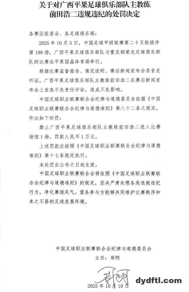 周五,中足联宣布,对辱骂广西平果主帅的重庆铜梁龙球员黄希扬处以停赛2场、罚款2万的处罚。