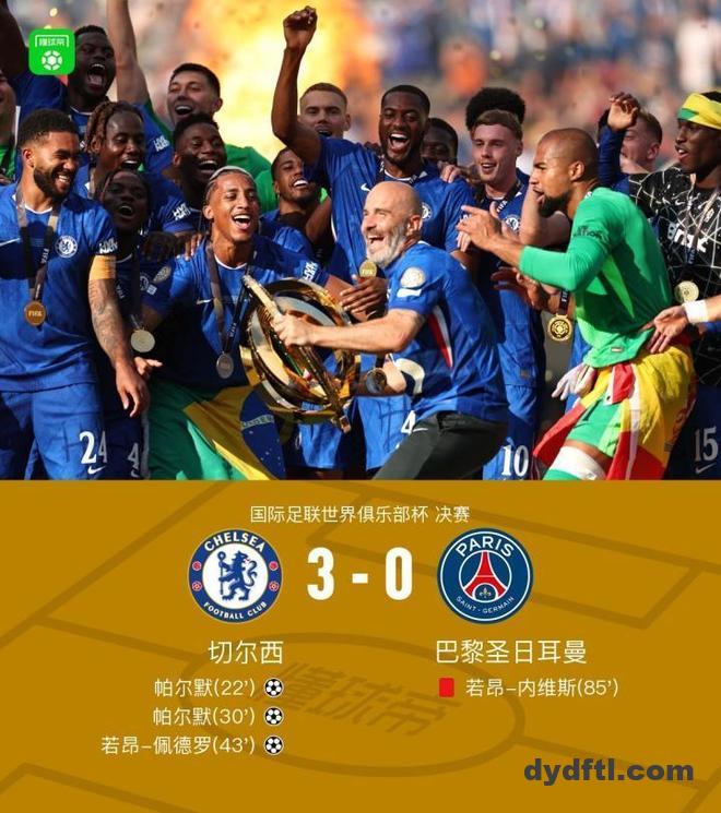 世俱杯决赛在美国新泽西州大都会人寿体育场展开角逐,切尔西对阵巴黎圣日耳曼,本场主裁判为法加尼(澳大利亚)。上半场,帕尔默天神下凡推射梅开二度后又助攻若昂-佩德罗挑射破门。下半场,若昂-内维斯拽库库雷利亚头发被直红罚下。最终,切尔西3-0完胜巴黎,夺改制后世俱杯首冠!