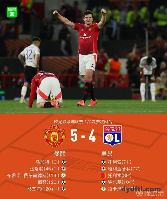 欧联1/4决赛次回合,曼联与里昂展开对决。上半场,乌加特和达洛特先后破门为曼联取得两球领先。下半场,托利索和塔利亚菲科6分钟内扳平比分,托利索随后吃到第二张黄牌被罚下。90分钟战罢,两队战平进入加时赛。加时赛,谢尔基破门,拉卡泽特点射得分。不过随后比赛进入最高潮,先是B费点球扳回一城。随后,梅努完成绝平。卡塞米罗传中,马奎尔头槌绝杀。全场比赛结束,曼联加时赛连进三球5-4逆转击败里昂,并且以两回合7-6的总比分晋级欧联4强。