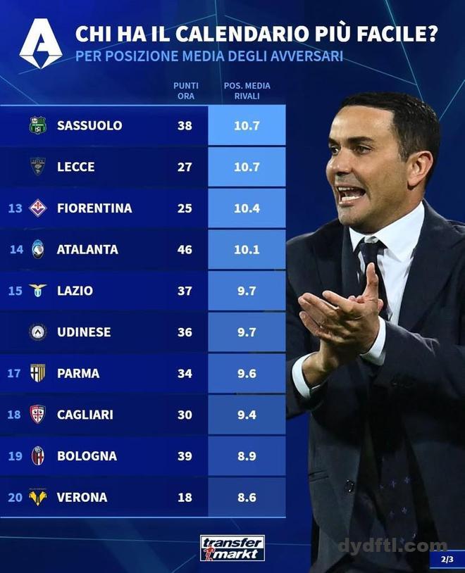 德转统计本赛季意甲最后10轮各队对手平均排名: