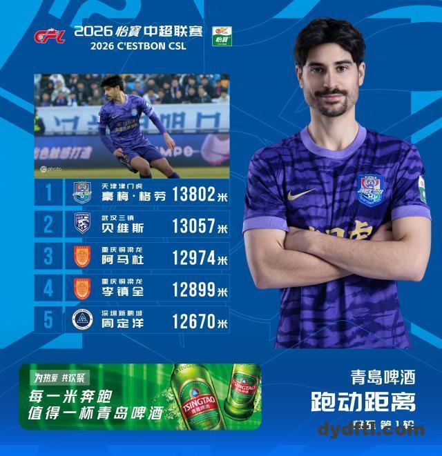3月11日,中超联赛官方公布了首轮联赛跑动榜,津门虎外援豪梅·格劳以13802米的跑动距离居首。