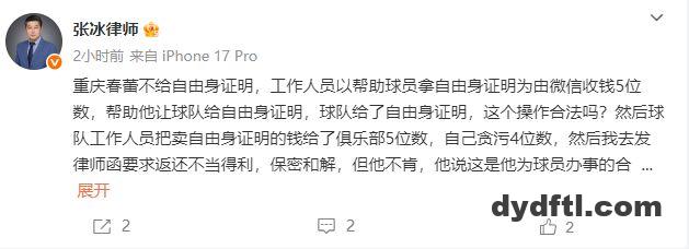 张冰透露,“重庆春蕾不给自由身证明,工作人员以帮助球员拿自由身证明为由微信收钱5位数,帮助他让球队给自由身证明,球队给了自由身证明,这个操作合法吗?然后球队工作人员把卖自由身证明的钱给了俱乐部5位数,自己贪污4位数,然后我去发律师函要求返还不当得利,保密和解,但他不肯,他说这是他为球员办事的合法收入,说要举报我,这个操作合法吗?”