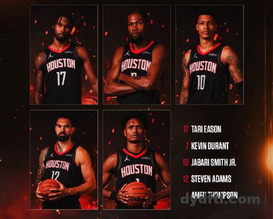 火箭:杜兰特、贾巴里-史密斯、亚当斯、阿门、伊森