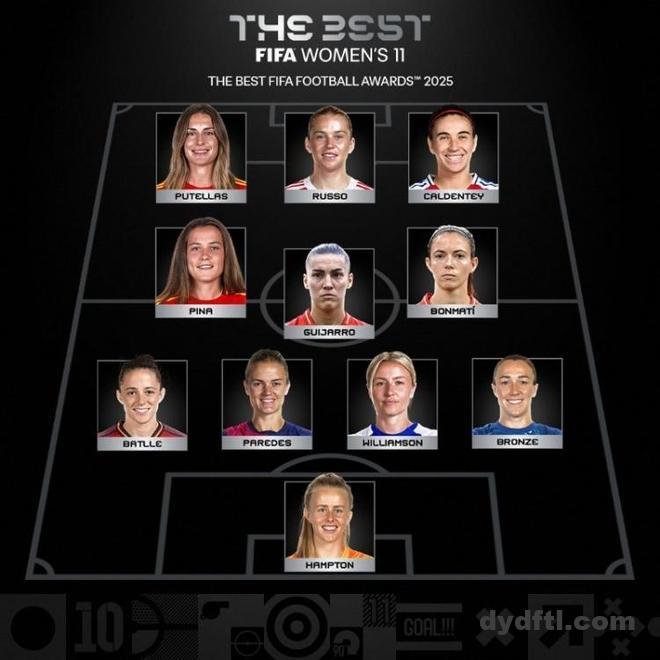后卫:布隆泽(英格兰/切尔西)、莉娅·威廉姆森(英格兰/阿森纳)、伊雷内·帕雷德斯(西班牙/巴萨)、奥娜·巴特勒(西班牙/巴萨)