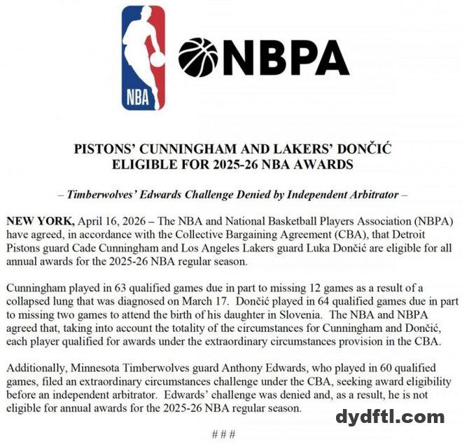 当NBA实施65场评奖规则,不少球星因为参赛场次不够无缘参与评奖。如今根据ESPN名记Shams报道,NBA和球员工会裁定,东契奇和坎宁安利用65场新规的“特殊情况挑战”申诉成功。如今NBA球员工会(NBPA)官方发布声明,确认他们获得评奖资格,而爱德华兹申诉失败无缘评奖。