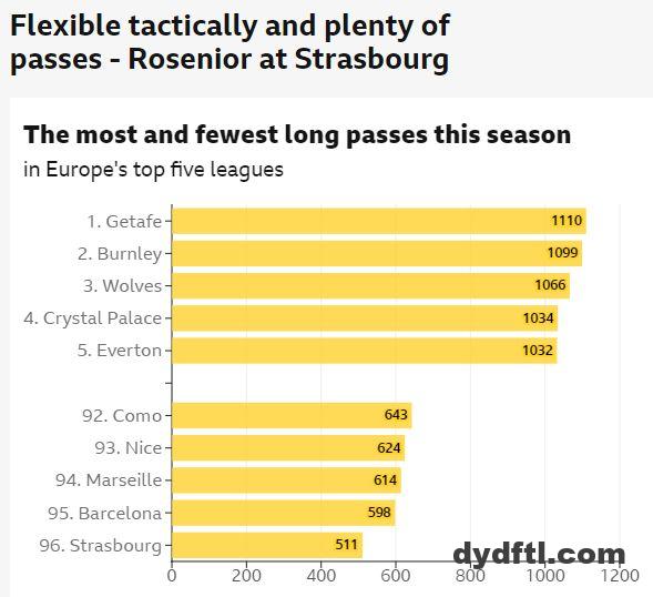 事实上,斯特拉斯堡只有511次长传,低于其他五大联赛球队,排名倒数第二位的巴萨则有598次长传,切尔西的长传次数则高达925次。