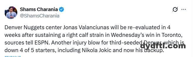 北京时间1月2日,名记Shams报道,据ESPN消息人士透露,丹佛掘金队中锋瓦兰丘纳斯在周四客场对阵猛龙队的比赛中右小腿拉伤,将在4周后接受复查。这对排名第三的掘金队来说无疑是又一次伤病打击,目前球队五名首发球员中已有四人缺阵,约基奇和他的替补瓦兰丘纳斯都受伤了。