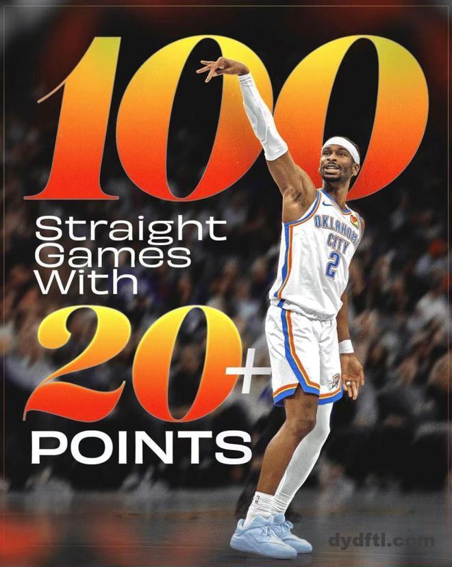 亚历山大创造连续100场比赛得分20+里程碑纪录,成为NBA历史第二人,仅次于张伯伦连续126场得分20+纪录。