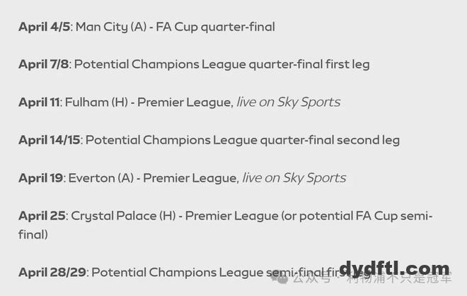下图:利物浦4月份的潜在赛程:
