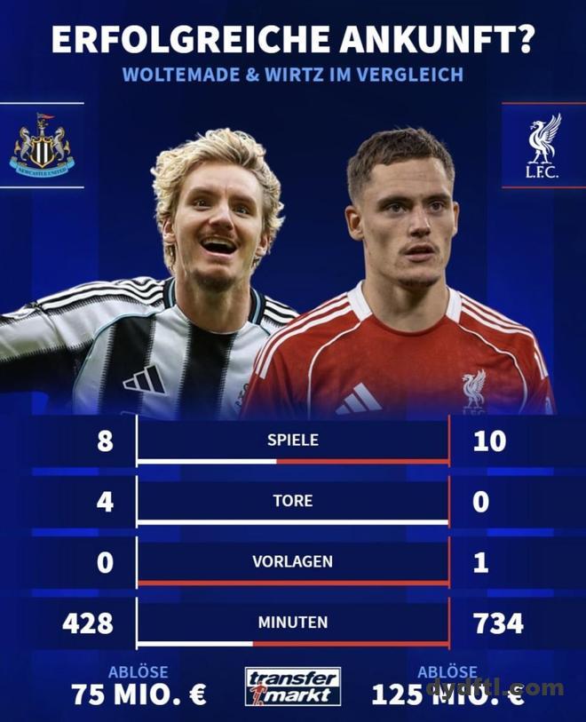 维尔茨今夏以1.25亿欧元加盟利物浦,前10场正式比赛交出0进球1助攻、734分钟的开局样本;同期,纽卡新援沃尔特马德8场4球、428分钟。