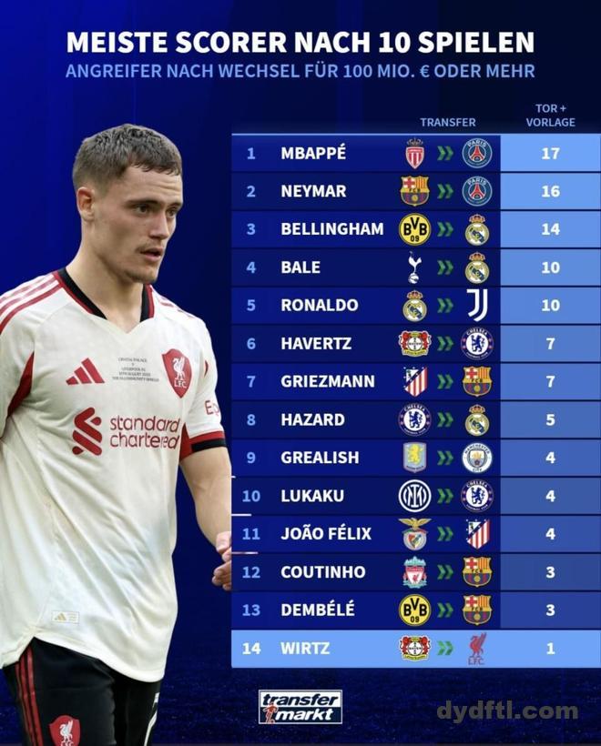 为了让大家直观看到维尔茨的开局位置,下面给出一个“转会费≥1亿欧球员,到新东家的前10场进球+助攻合计”的清单。你能一眼对比出巅峰即爆的样本(姆巴佩、内马尔、贝林厄姆),也能看到常见的慢热区间。