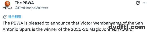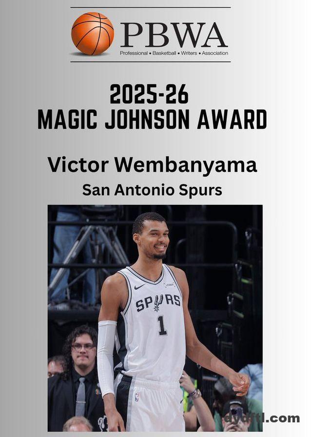 北京时间4月17日,美国职业篮球作家协会今日宣布,圣安东尼奥马刺队的维克托-文班亚马斩获2025-26赛季魔术师约翰逊奖。该奖项旨在表彰赛场表现出众,同时在对接媒体、对待球迷时兼具配合度与优雅风度的NBA球员。