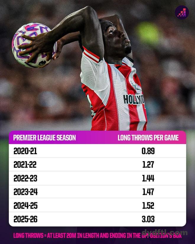 在刚刚开始的这个赛季里,我们已经看到了3粒长掷界外球进球,也就是平均每10场比赛就会出现1球。相比之下,上赛季虽然创纪录打进14球,但平均下来是每27场才出现1球;而在2023/24赛季,更是每76场比赛才有1球。