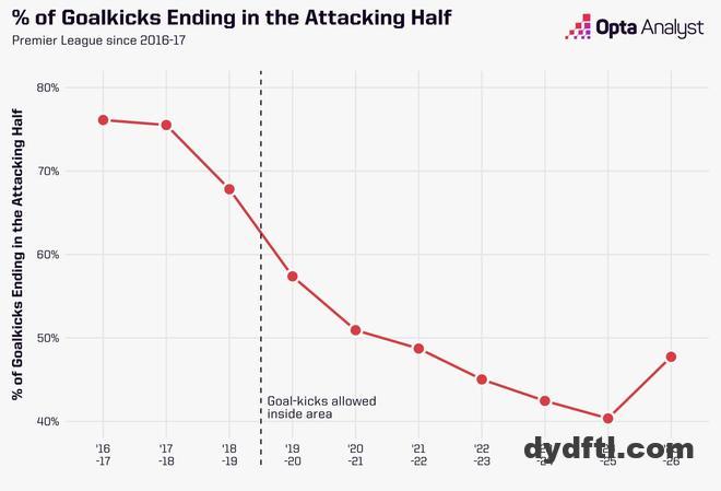 数据显示,从2016-17赛季到2024-25赛季,球门球进入对方半场的比例逐年下降。但在2025-26赛季前三轮,这一比例却出现了明显回升,幅度之大足以说明问题。