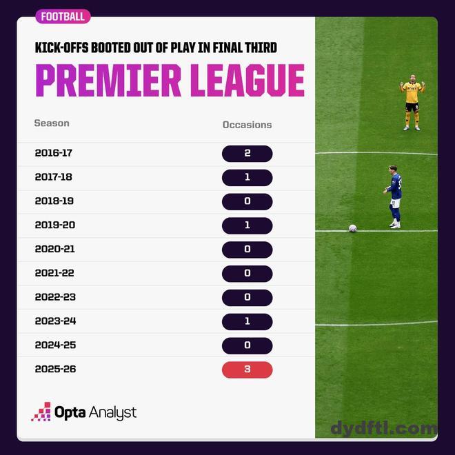 在2025/26赛季,已经有3次开球被直接踢出边线,落点都在对方后场三区。这一数字相当于过去5个赛季的总和。换句话说,本赛季30场英超比赛里出现了3次,而此前1900场比赛中仅发生过1次。