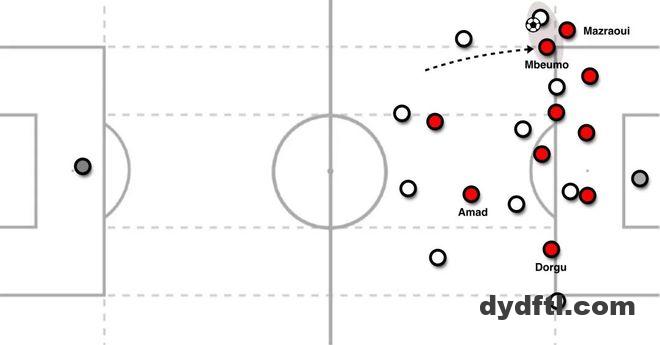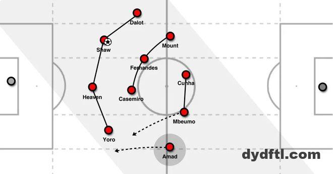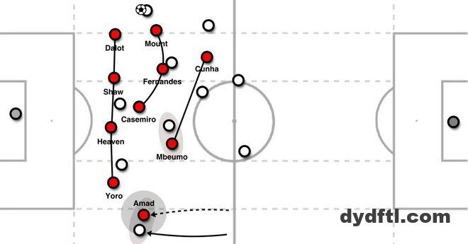 从对角线观察,布鲁诺·费尔南德斯更像一名游走在中路的全能中场,比起防守型中场反而更接近10号角色。芒特从左路插上,与布鲁诺搭成一个临时的不对称中场三人组,二人都提供进攻推进,而卡塞米罗在其身后做保护。更靠前的位置上,库尼亚与姆伯莫可以互换位置,也都可以回撤拿球;既能做脚下球的传球选择目标,也能向对方后防线身后跑位要身后球。另一侧,阿马德担任进攻转换的主要输出,是转移球路时的目标点。
