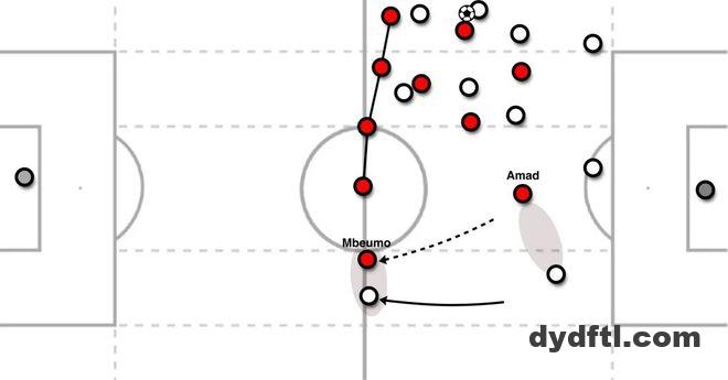 图 3.1 – 曼联对阵布莱顿:姆伯莫在转换中回追扫荡,而阿马德则留在更靠前的位置上。