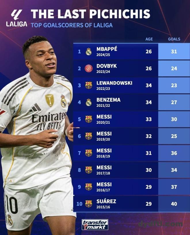 最近德国转会市场网站发布了近10年西甲皮奇奇得主榜单,姆巴佩、梅西、苏亚雷斯等顶级射手全部在列。刚拿到个人首座皮奇奇奖的姆巴佩,在皇马首季就踢出31球的成绩,单季效率已经能和梅西、苏亚雷斯的高光年份放在一起比较。有意思的是,如果把这组数据平移到梅西连拿皮奇奇的那些赛季,金靴的归属很可能会出现不一样的结果。(数据截至北京时间2025年11月25日)
