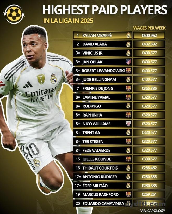 最近球员公司(Capology)发布了西甲球员周薪榜:姆巴佩领跑,较第二名高约38.9%;皇马上榜11人、巴萨7人,马竞与毕尔巴鄂各1人。榜单直观看到皇马在顶薪段占主动,形成“顶薪+核心平台”的梯度;巴萨更多押在32万欧元/周的平台上,却要同时扛住老将高薪与新星提价的拉扯——这套薪资结构更稳,还是更难续?下面就按俱乐部拆开聊。