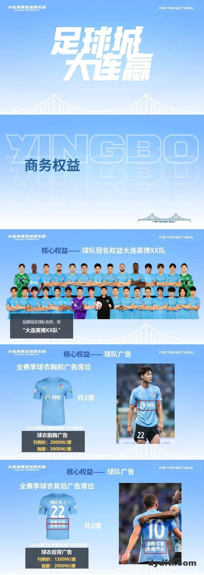 大连英博发布2026中超招商合作手册,现面向市场公开招商,涵盖球队冠名权、球衣胸前广告、球衣背后广告等权益。