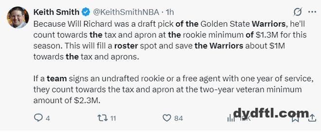 根据肯尼-史密斯的说法,因为理查德是勇士自主选中的新秀,他最多只占用130万的薪金空间,如果勇士要签一位不是自己选秀的球员或老将至少要占据230万的空间,所以签下理查德节省了100万的空间。