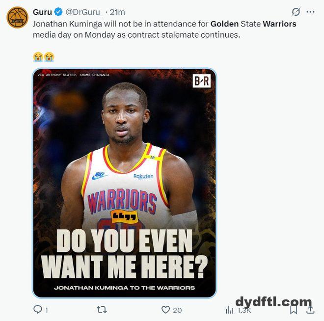 但是根据Shams的报道,乔纳森-库明加因为跟勇士队的续约没有谈拢,他将不会出席勇士队的媒体日,勇士队会在美国时间周三决定最终给库明加什么额度的合同。