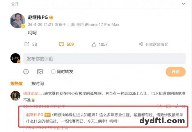 赵继伟赛后通过社媒写道:“呵呵”耐人寻味。